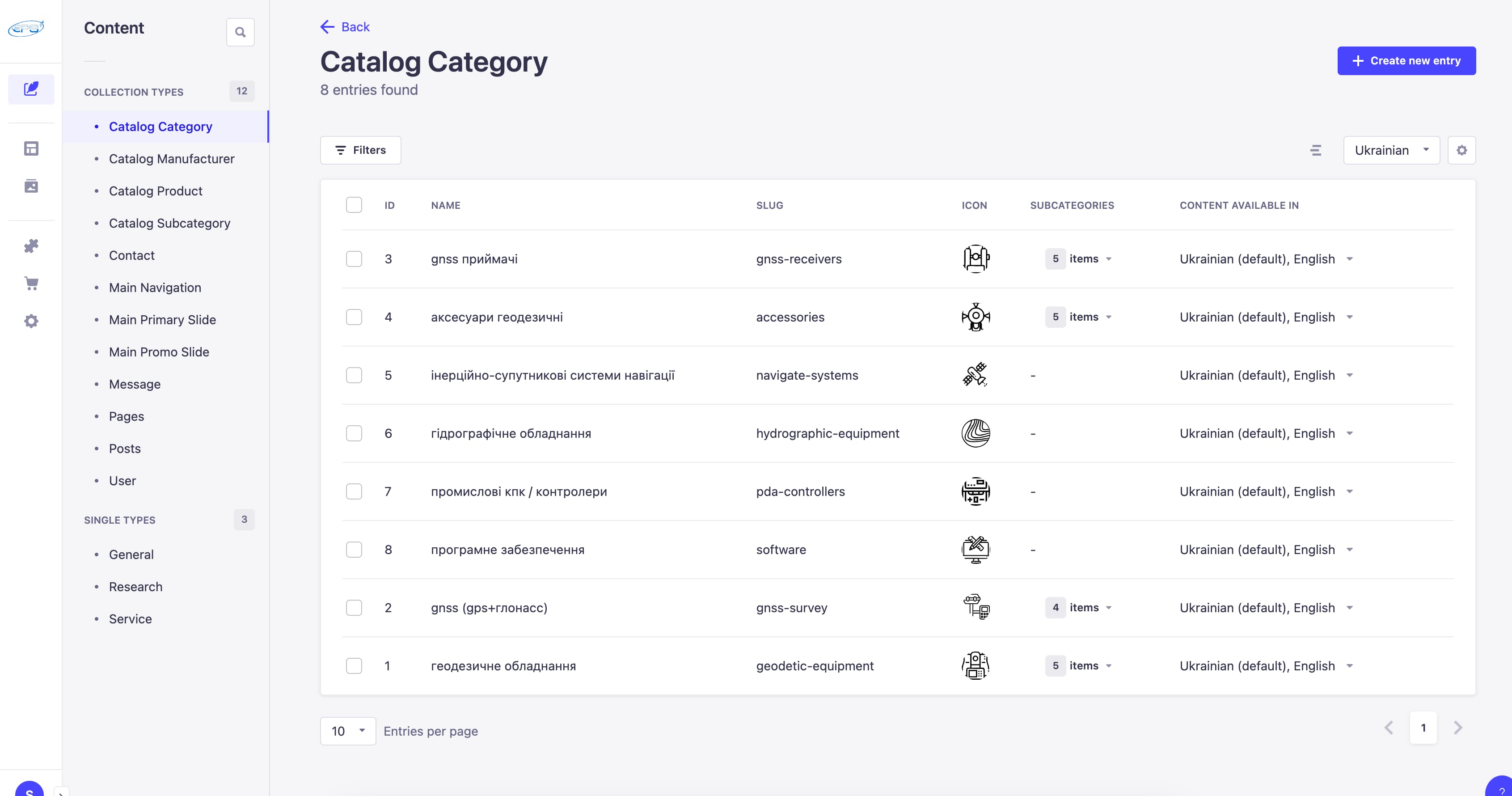 Product site for a navigation and surveying equipment brand — full catalogue with CMS-controlled content.
